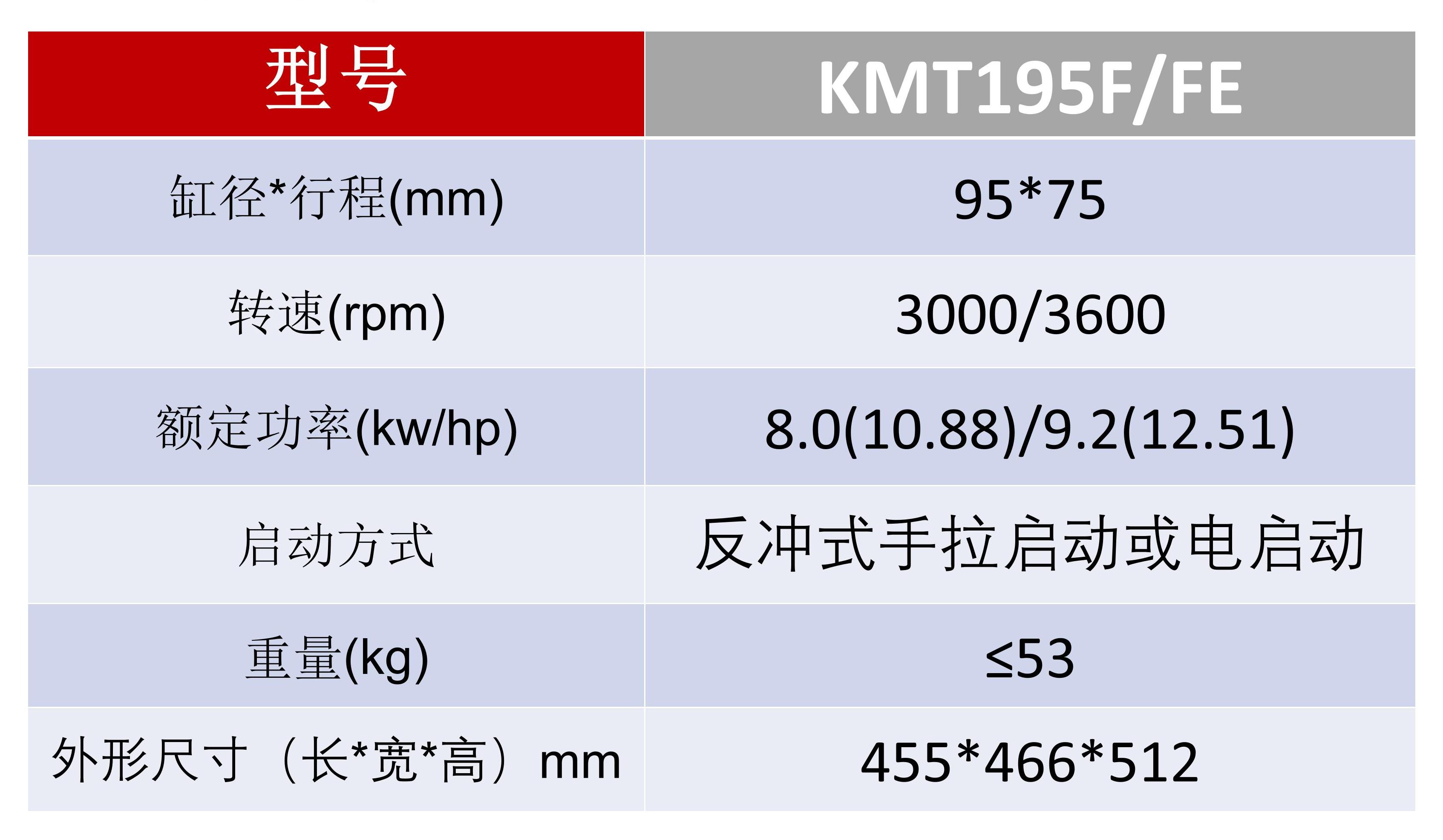 型号:KMT195F/FE 功率:9.2KW/ 12.51HP 排量:0.532L