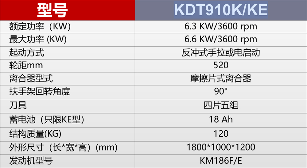 型号:KDT910K/KE 功率:6.6KW/9HP 发动机型号:KM186F/E