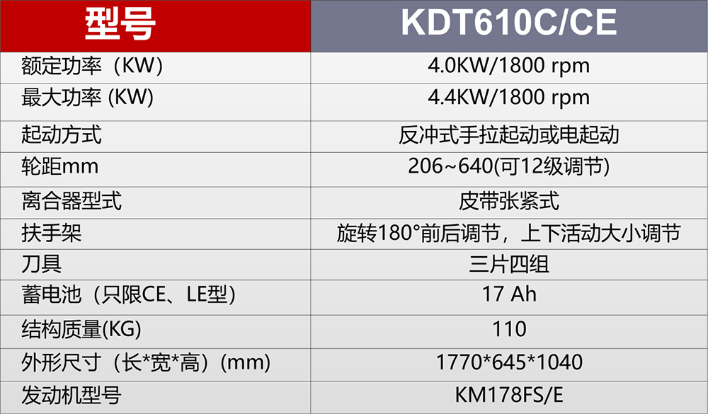 型号:KDT610C/CE 功率:4.4KW/6HP 发动机型号:KM178FS/E