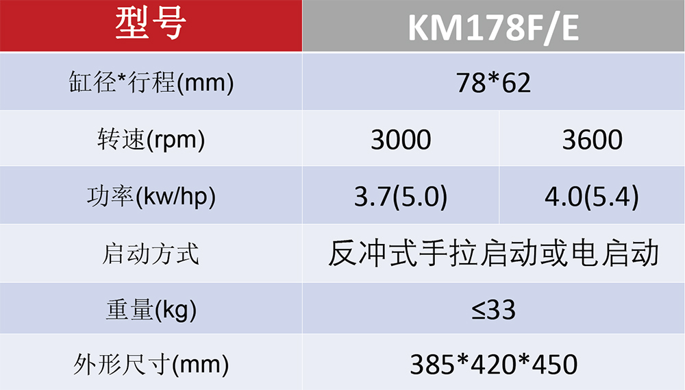 型号:KM178F/E 功率:4.0KW/ 5.4HP 排量:0.296L