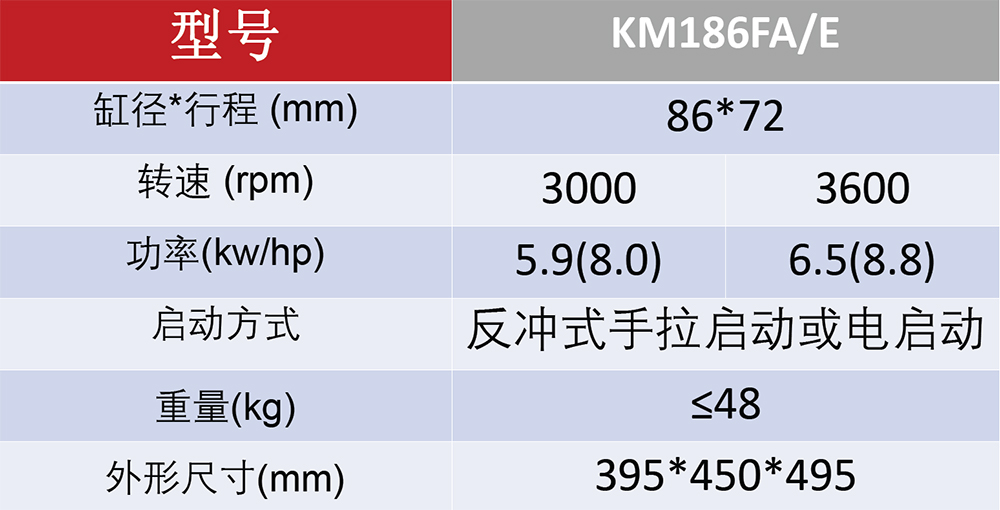 型号:KM186FA/E 功率:6.5KW/ 8.8HP 排量:0.418L