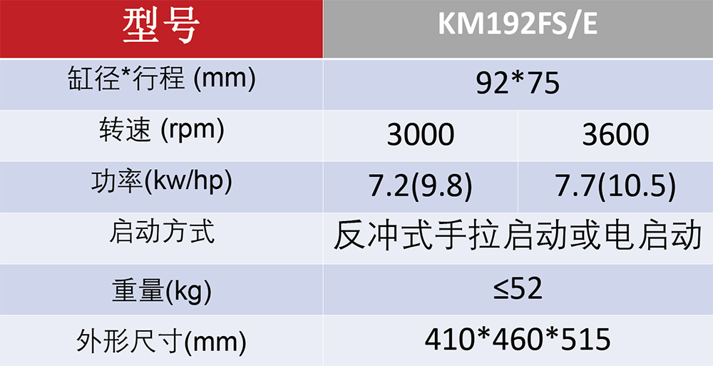 型号:KM192FS/E 功率:7.7KW/ 10.5HP 排量:0.499L