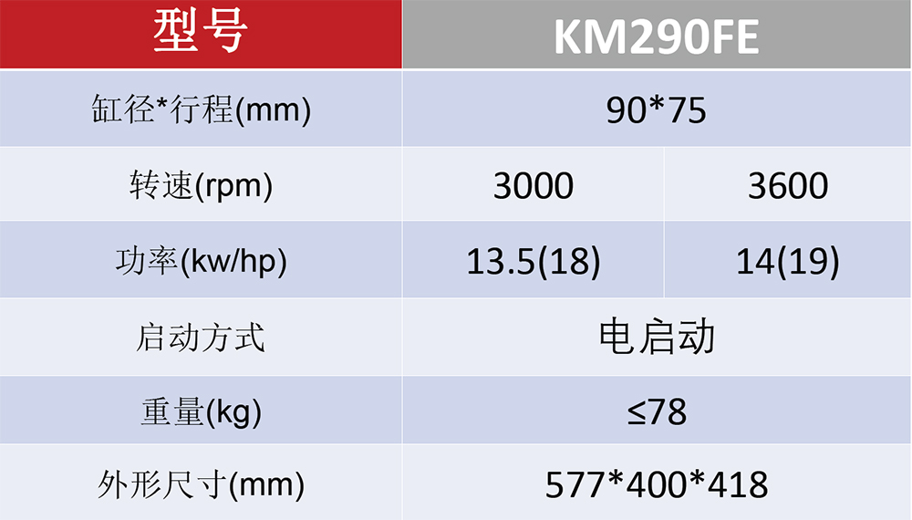 型号:KM290FE 功率:14KW/19HP 排量:0.954L