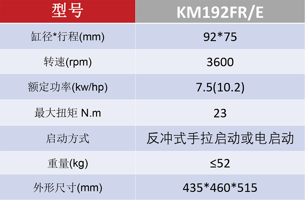 型号:KM192FR/E 功率:7.5KW/ 10.2HP 排量:0.499L