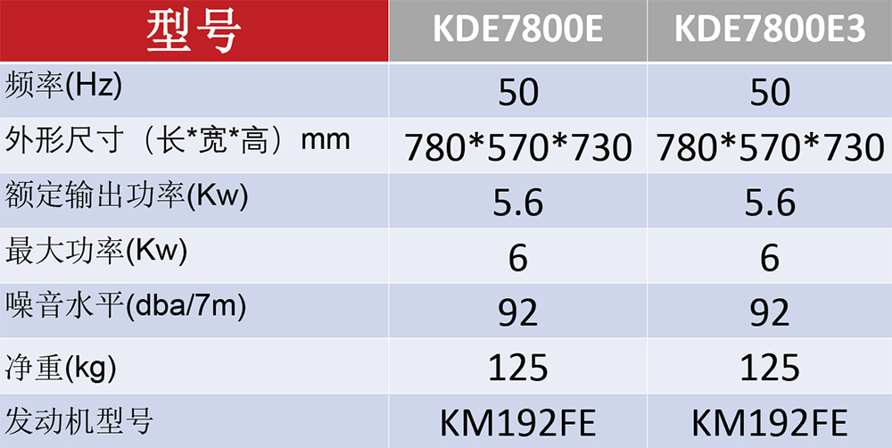 型号:KDE7800E 功率:5.6KW 发动机型号:KM192FE