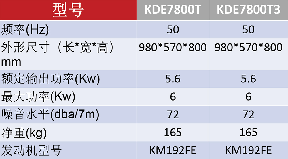 型号:KDE7800T 功率:5.6KW 发动机型号:KM192FE