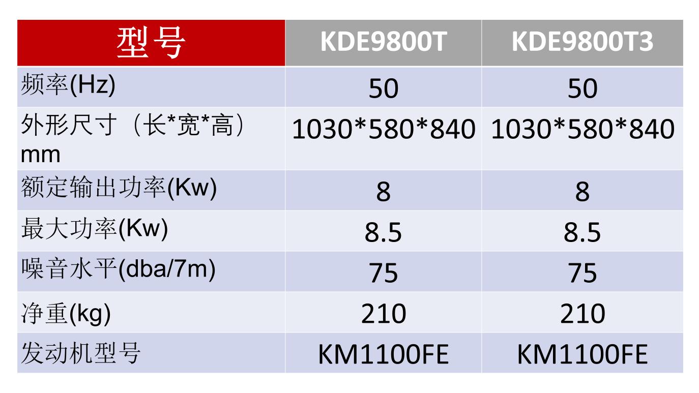型号:KDE9800T 功率:8KW 发动机型号:KM1100FE